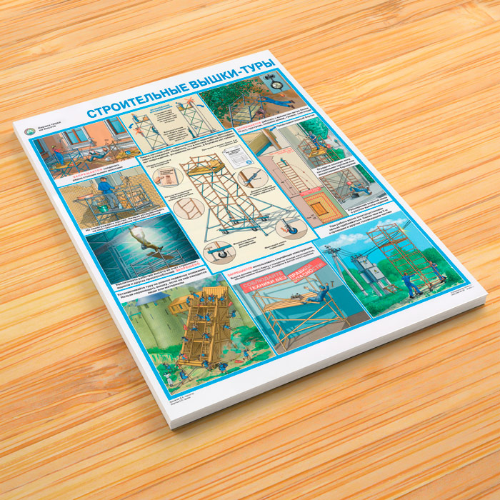 Плакат «Охрана труда на высоте. Строительные вышки-туры» в доступной форме рассказывает о правилах безопасной работы на высоте с использованием строительных вышек. Освещаемые темы: установка туры, использование грузоподъемных механизмов, работа в непогоду, ограждение опасных зон