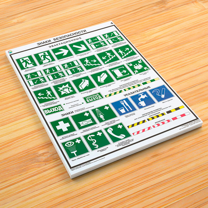 • Плакат с эвакуационными знаками, знаками медицинского и санитарного назначения, указательными знаками и сигнальной разметкой