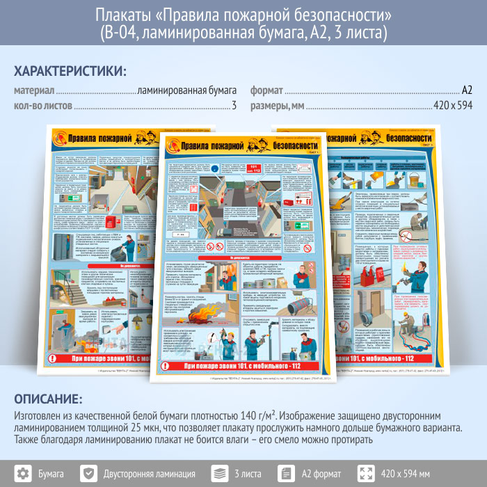 Плакаты «Правила пожарной безопасности» (В-04, ламинированная бумага, А2, 3 листа) в Уфе купить