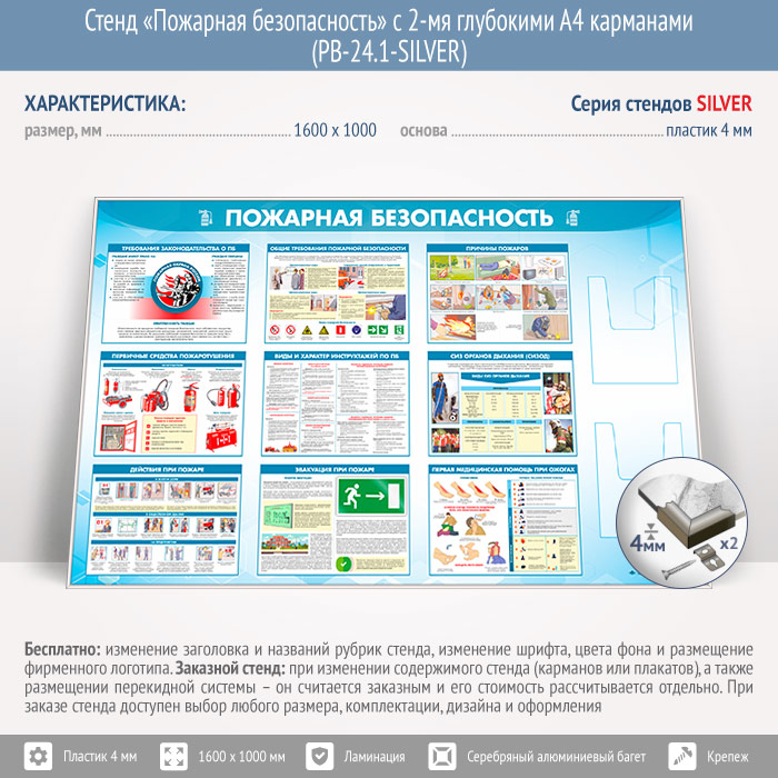 Стенд «Пожарная безопасность» с 2-мя глубокими А4 карманами (PB-24.1-SILVER) в Уфе купить