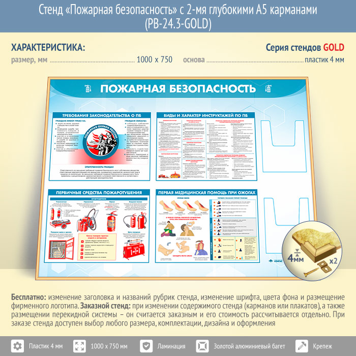 Стенд «Пожарная безопасность» с 2-мя глубокими А5 карманами (PB-24.3-GOLD) в Уфе купить