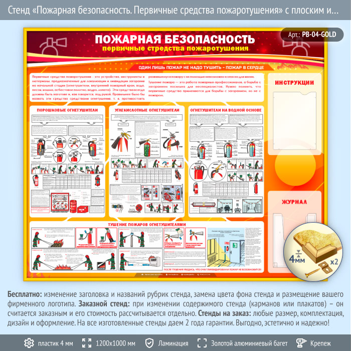 Стенд «Пожарная безопасность. Первичные средства пожаротушения» с плоским и объемным карманами (PB-04-GOLD) в Уфе купить
