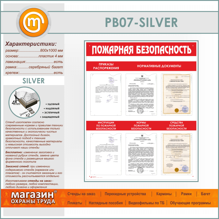 Стенд «Пожарная безопасность» с 6 карманами (PB-07-SILVER) в Уфе купить