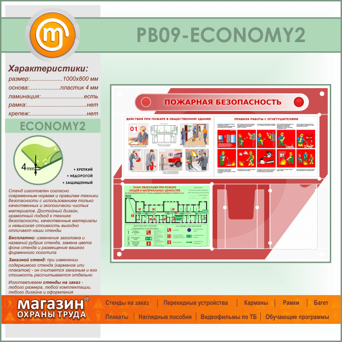 Стенд «Пожарная безопасность» с планом эвакуации, плоским и объемным карманами (PB-09-ECONOMY2) в Уфе купить