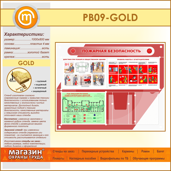 Стенд «Пожарная безопасность» с планом эвакуации, плоским и объемным карманами (PB-09-GOLD) в Уфе купить
