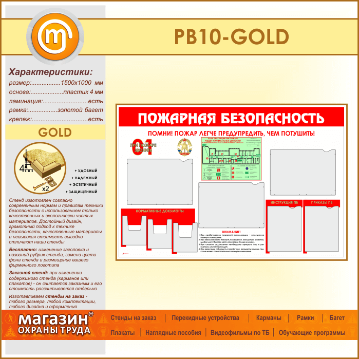 Стенд «Пожарная безопасность» с планом эвакуации, 5 плоскими и 3 объемными карманами (PB-10-GOLD) в Уфе купить