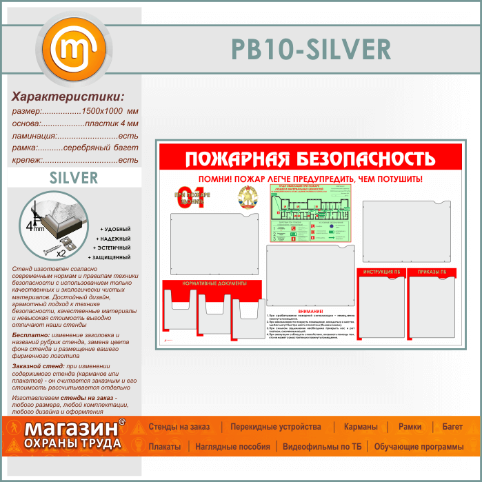 Стенд «Пожарная безопасность» с планом эвакуации, 5 плоскими и 3 объемными карманами (PB-10-SILVER) в Уфе купить