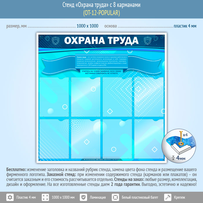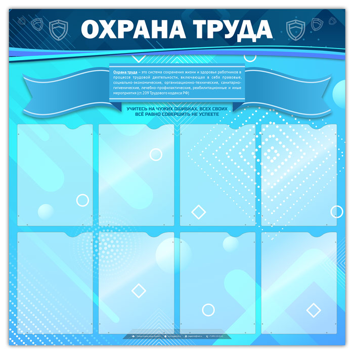Стенд «Охрана труда» – это 8 плоских карманов А4 формата для самостоятельного размещения необходимой информации – будь то графики или инструктажи, приказы или инструкции, нормативы или объявления…