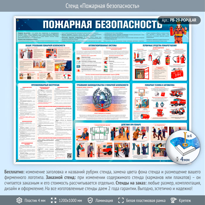 Стенд «Пожарная безопасность» (PB-29) содержит наглядную информацию по обеспечению пожарной безопасности на объекте. На стенде представлены общие требования, порядок проведения противопожарного инструктажа, действия при пожаре в общественных зданиях и на предприятиях. Освещены виды первичных средств пожаротушения, автоматизированные системы защиты, средства оповещения и эвакуации, а также требования законодательства и ответственность граждан. Стенд помогает формировать культуру безопасности, обучать персонал и предотвращать чрезвычайные ситуации, связанные с пожарами.