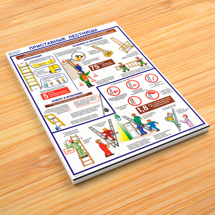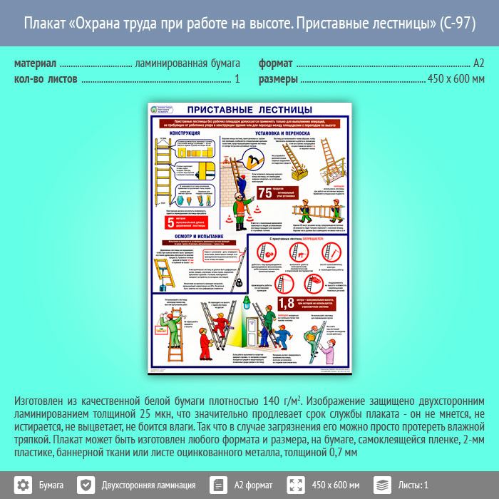 Плакат «Охрана труда при работе на высоте. Приставные лестницы» (С-97, ламинированная бумага, А2, 1 лист) в Уфе купить