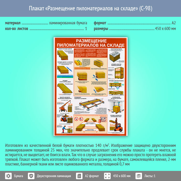 Плакат «Размещение пиломатериалов на складе» (С-98, ламинированная бумага, А2, 1 лист) в Уфе купить