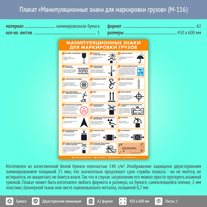 Плакат «Манипуляционные знаки для маркировки грузов» (М-116, ламинированная бумага, А2, 1 лист) в Уфе купить