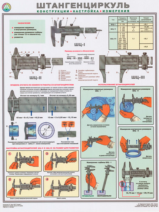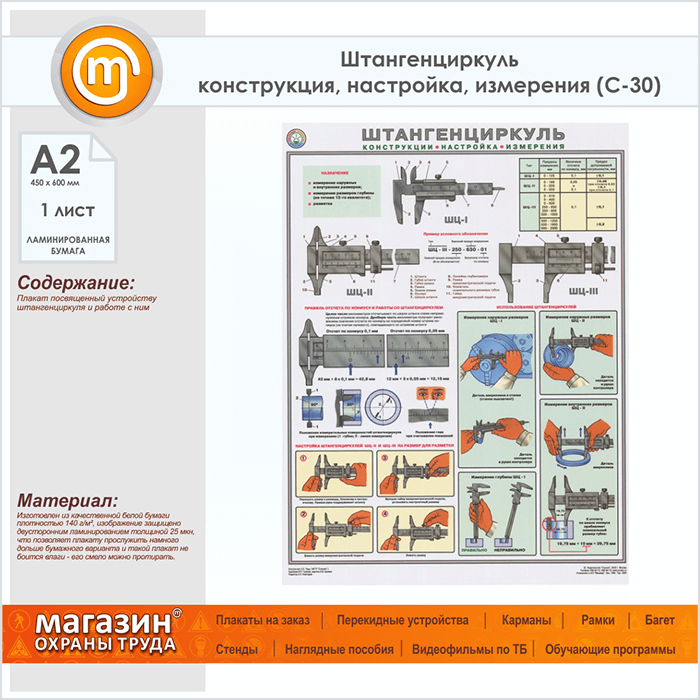 Плакат «Штангенциркуль - конструкция, настройка, измерения» (С-30, ламинированная бумага, А2, 1 лист) в Уфе купить